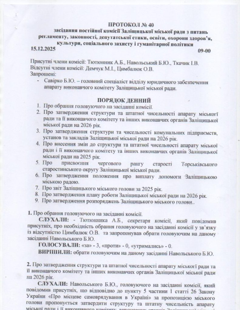Комісія з питань регламенту, законності, депутатської етики, освіти, охорони здоров’я, культури, соціального захисту та гуманітарної політики